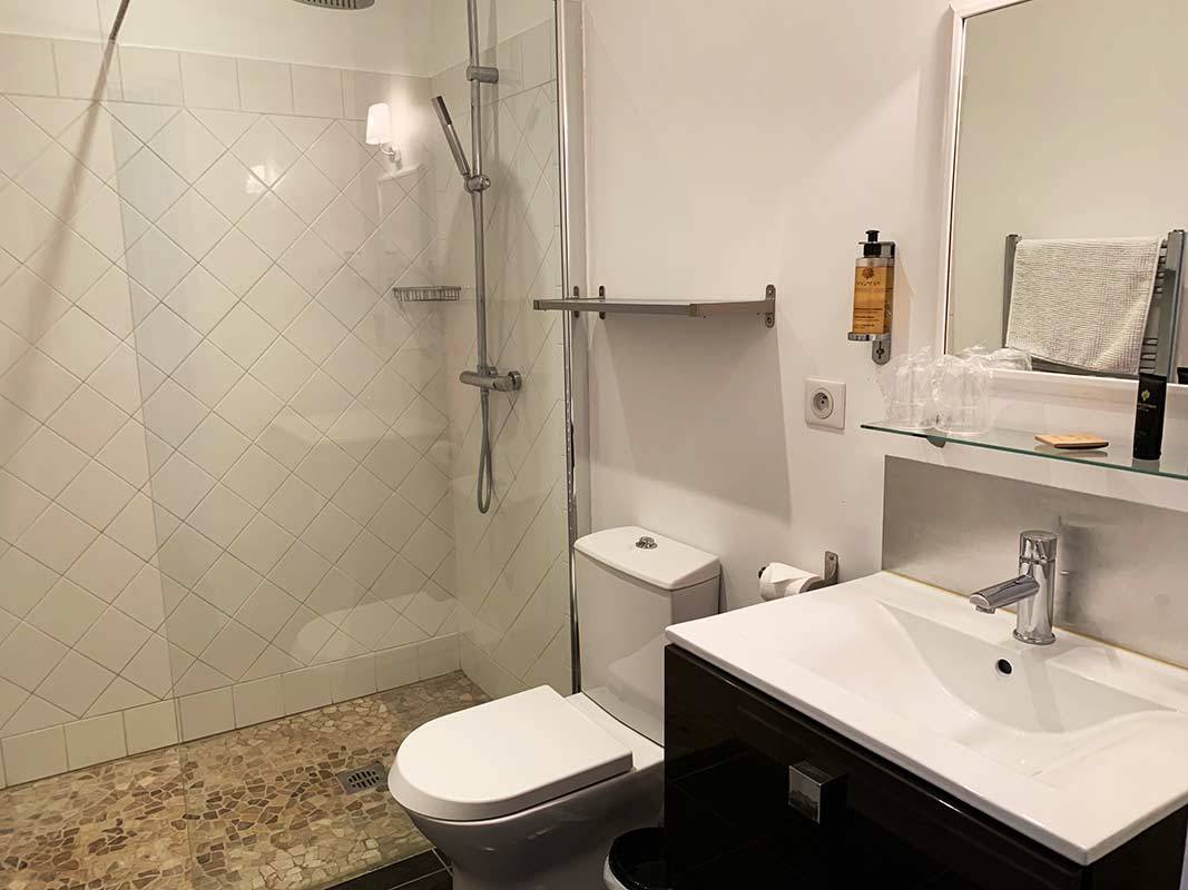 Chambre climatisée, disposant de tout confort et comprenant une salle de bain et toilette privée ( douche à l'italienne), écran plat, bouilloire, café , thé, produit toilette, sèche-cheveux